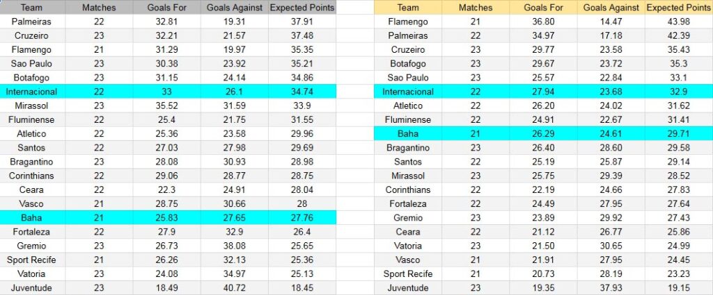 Bahía sin dudas ha mostrado su mejor cara cuando juega ante su público. Su promedio de goles en casa de 1,78 lo muestra como un equipo ofensivamente activo jugando en su estadio. Allí suele dominar a sus rivales, incluso como ya vimos con las victorias ante Palmeiras y Flamengo, los mejores equipos de la liga.