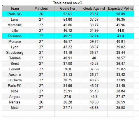 Solo hay 10 puntos de diferencia entre los equipos en la tabla de puntos xG, mientras que hay 23 puntos de diferencia en la tabla real. Sin embargo, esta es una tendencia que vemos a menudo con los mejores equipos como PSG porque tienen delanteros muy efectivos.