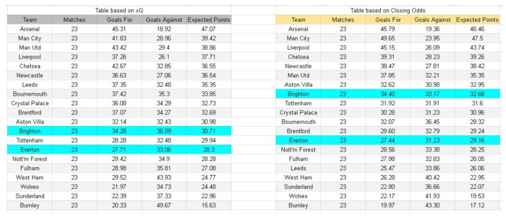 No se puede evitar preguntarse si se aproxima alguna regresión, ya que en los últimos 10 partidos, los datos de xG dicen que Brighton debería haber conseguido 13 puntos, pero solo ha obtenido 8, mientras que Everton ha conseguido 15 y merecía 11.5.