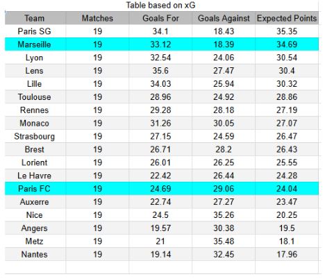 Las estadísticas de puntos xG muestran que Paris FC tiene 24 pero solo 20 en la tabla real. Marseille tiene 34 puntos xG pero 38 puntos en la tabla real. Esto es muy común en equipos de la parte alta de la liga, ya que cuentan con los mejores goleadores.