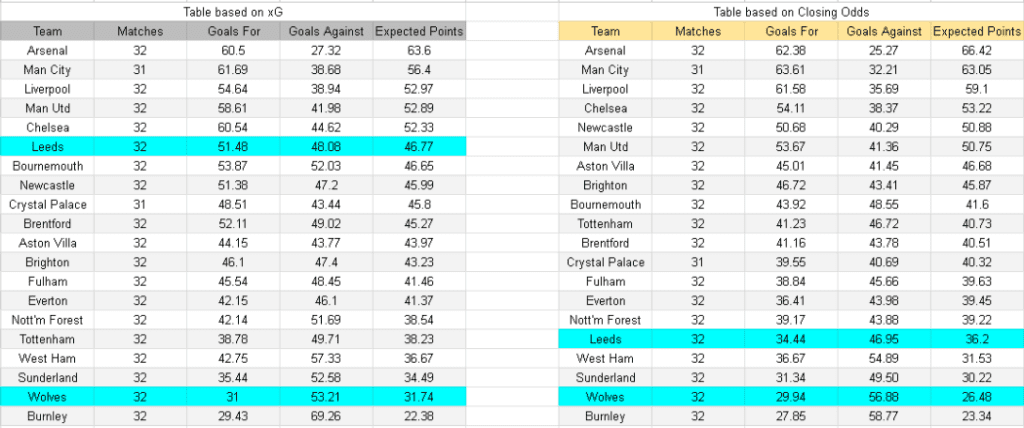 Si todos los equipos hubieran marcado y encajado goles de acuerdo con sus goles esperados, el Leeds estaría 6º en la tabla y tendría casi asegurada su participación en Europa la próxima temporada. En cambio, tiene casi 11 puntos por debajo de lo esperado, lo que lo sitúa como el segundo peor de la liga.
